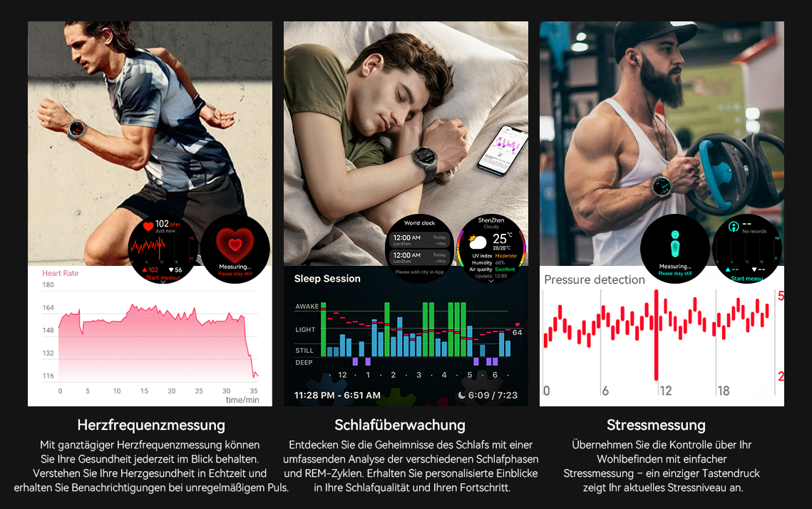 - 24/7 Gesundheitswächter – Echtzeitüberwachung von Herzfrequenz, Blutsauerstoff und Stress für Sicherheitswarnungen.