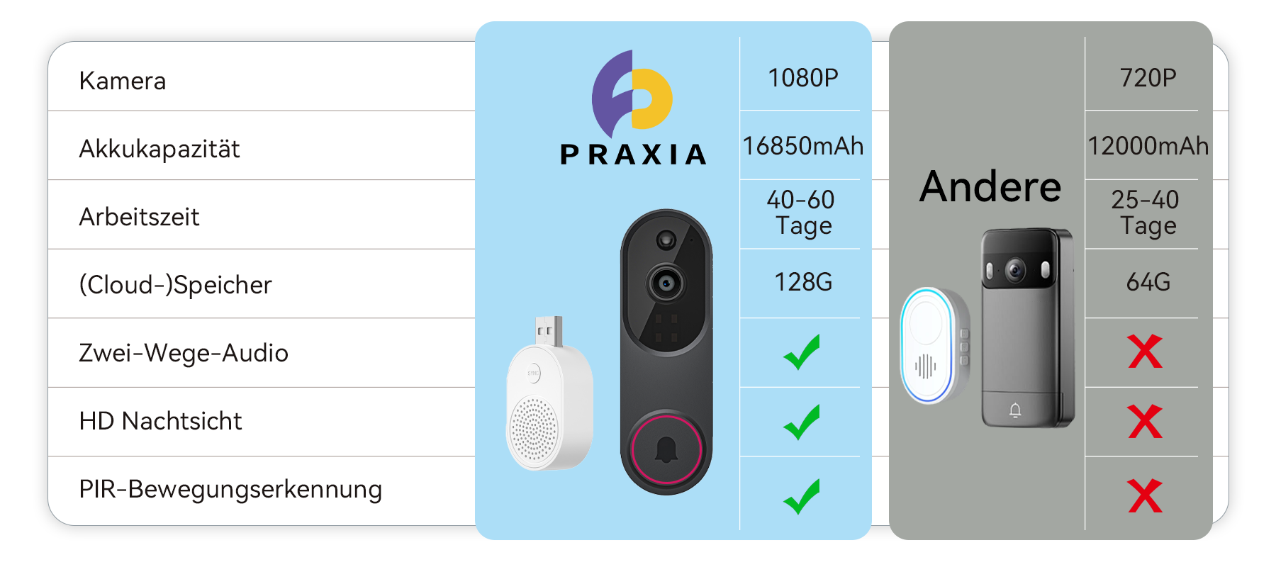 Das Ergebnis war die Praxia Video-Türklingelkamera. Mit fortschrittlicher KI-Erkennung und HD-Nachtsicht sorgt sie dafür, dass Ihr Zuhause Tag und Nacht zuverlässig geschützt ist. Die Kernaufgabe von Praxia ist es, Sie niemals im Stich zu lassen und Ihre Familie stets zu schützen.
